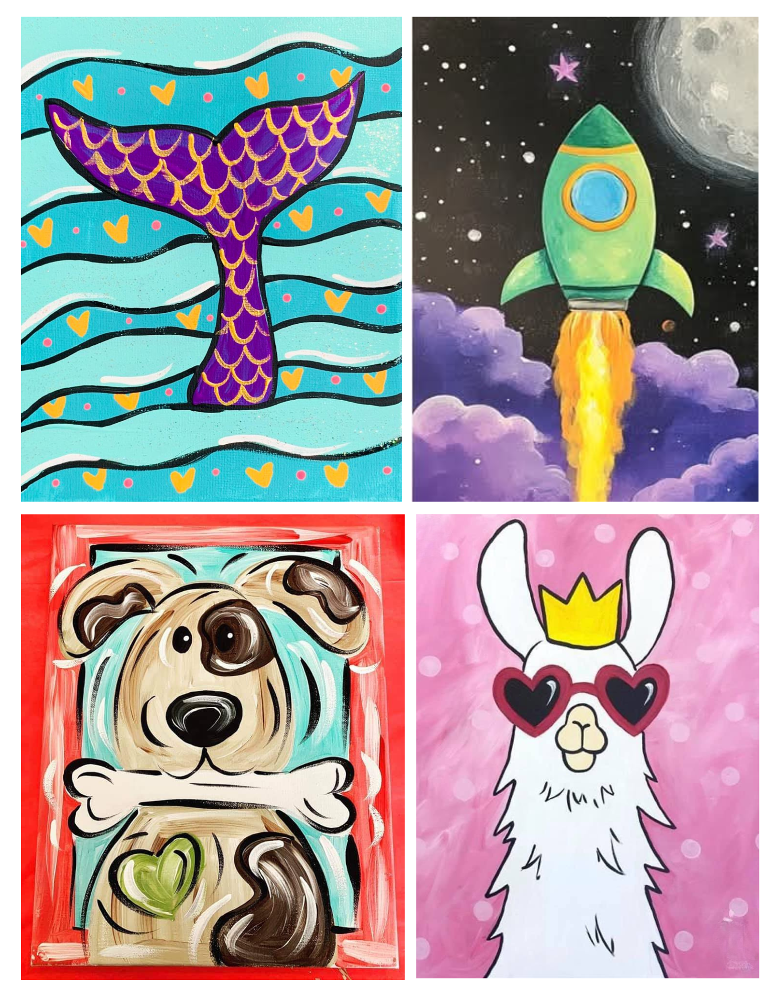 Our two-hour-long birthday parties at our studio include set up/clean up, themed studio painting lesson, art cupcake decorating, photo booth props, and background. Ask about add-ons such as a custom-designed theme, goody bags, art smocks, etc.